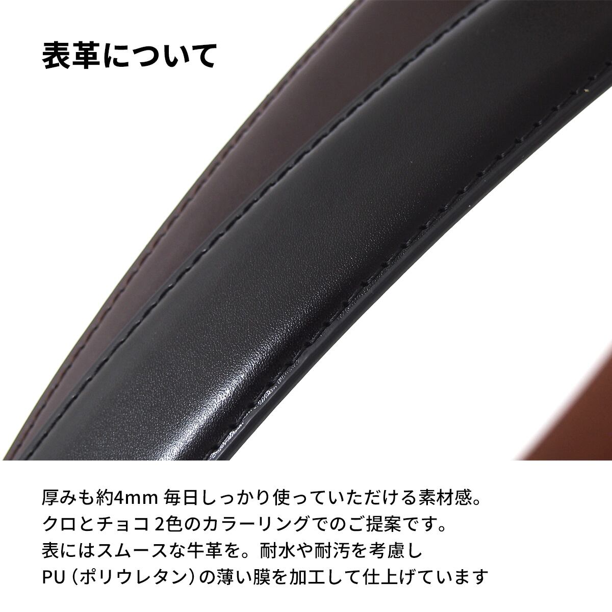 落ち着きのある表情。自由にどこでも留めれるフィットバックルが とても便利。厚みも約4mm 毎日しっかり使っていただける素材感。クロとチョコ 2色のカラーリングでのご提案です。