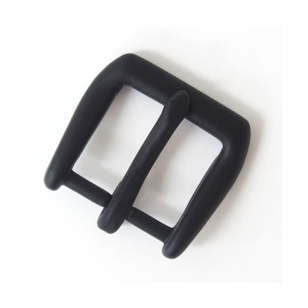 亜鉛合金のバックルに 黒の塗装を行なった後 ラバーコーティングで仕上げました。